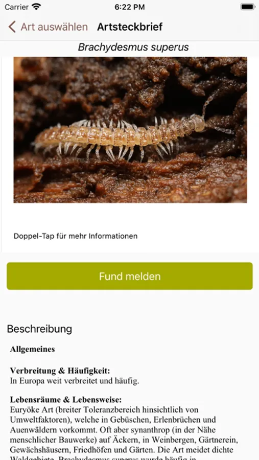 Eigene Funde und Belegfotos kannst Du nicht nur innerhalb deiner persönlichen Fundliste dokumentieren, sondern auch samt den Informationen zum Fundort an ein Expert*innen-Team melden. Nach einer Prüfung geben diese Deine Fundmeldung in der Forschungsdatenbank (https://portal.edaphobase.org/) frei, sodass Deine Beobachtungen direkt zur Erforschung von Bodentieren beigetragen.