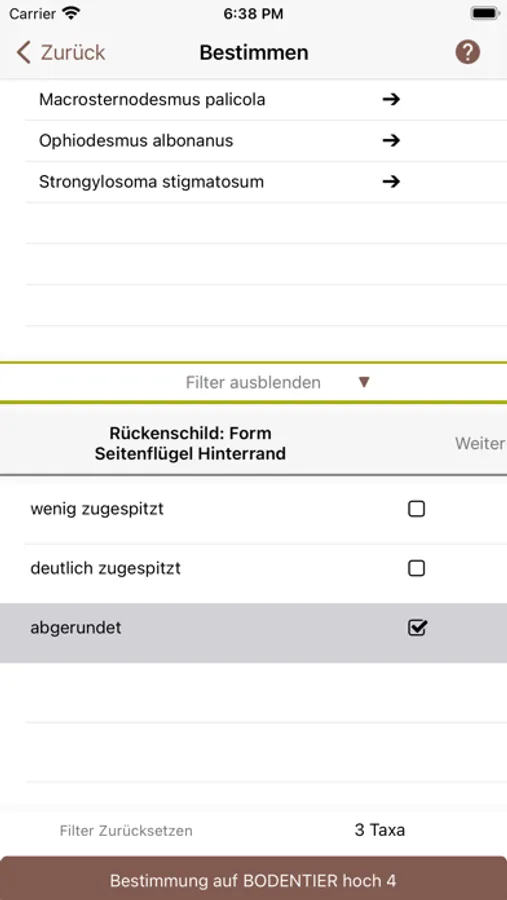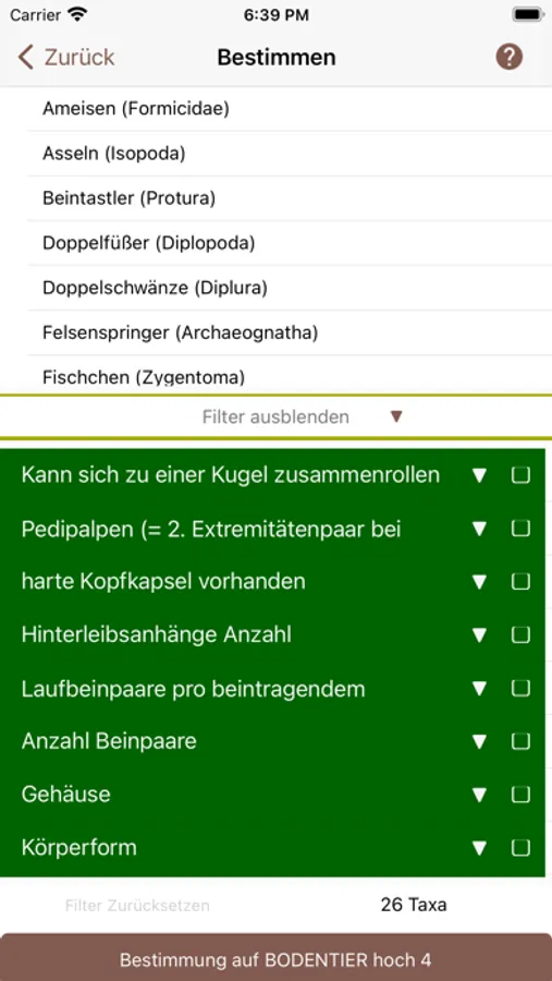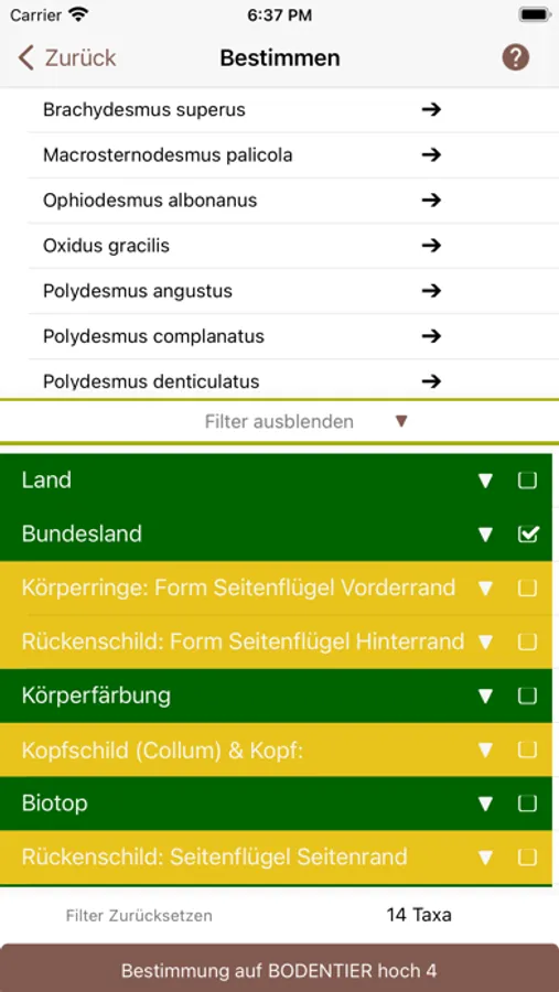 Wichtig: Die Bestimmung von Bodentieren, besonders bis zur Art, bedarf einer gewissen Einarbeitung in den Körperbau der Tiere und die Fachbegriffe. Wir haben versucht Dir dies durch die Bebilderung wichtiger Merkmale des Bestimmungsschlüssels zu erleichtern. Dennoch ist uns bewusst, dass die App noch weiterer Verbesserungen und Vereinfachungen bedarf, um allen Interessierten den Einstieg in die Bestimmung der Bodentiere zu ermöglichen. Wir bitten Dich deshalb ausdrücklich uns ein FEEDBACK zur App mit Verbesserungsvorschlägen zu geben. Dazu kannst du gerne den folgenden Link nutzen: https://docs.google.com/document/d/14-Qjxpsvu6uXARas0QOVU7xlhi-Bpqycal_pX7GdvrQ/edit#. Wir freuen uns über jede konstruktive Rückmeldung und hoffen damit die App-Navigation und Bestimmungsschlüssel mittelfristig noch intuitiver und nutzerfreundlicher gestalten zu können.