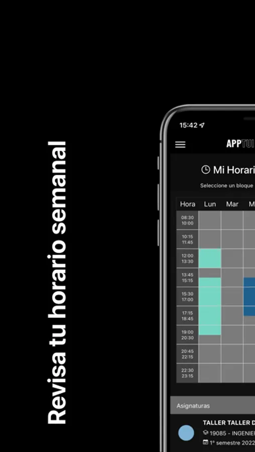 - Visualizar tu horario ordenado semanalmente con tus asignaturas.