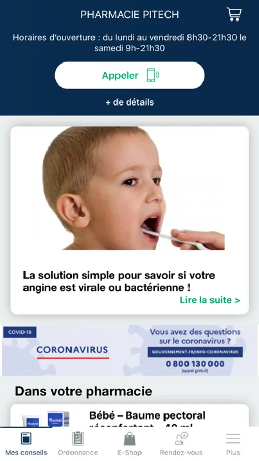 - Le Click & Collect : profitez d’offres et de produits disponibles dans votre pharmacie directement sur votre smartphone. Une fois vos produits choisis, une alerte SMS vous informe lorsque votre commande est prête. Passez ensuite les prendre chez votre pharmacien sous 48h.