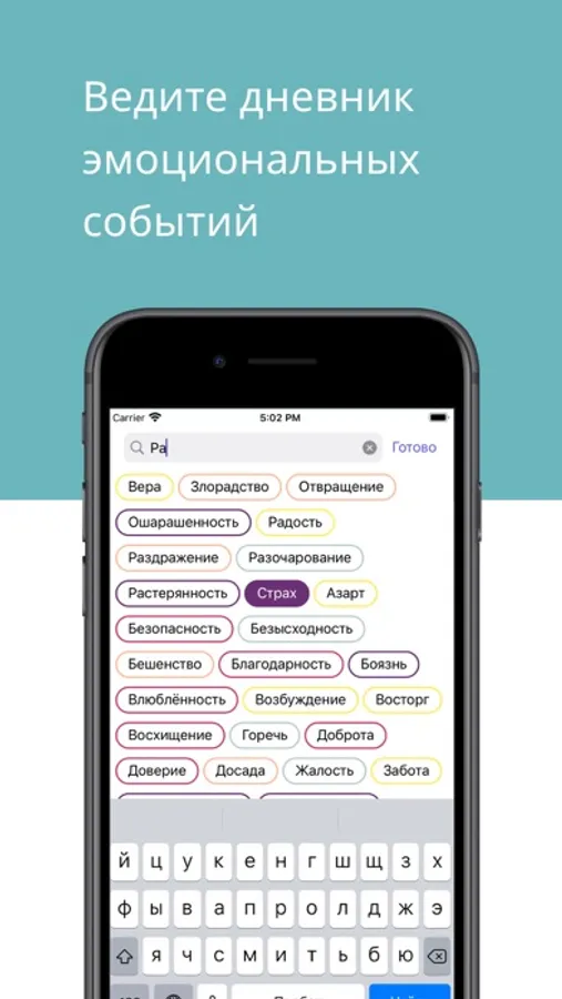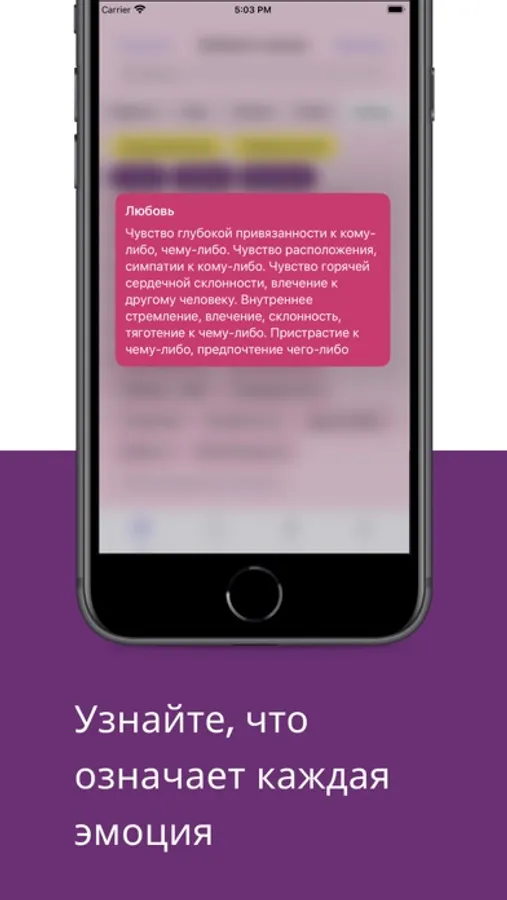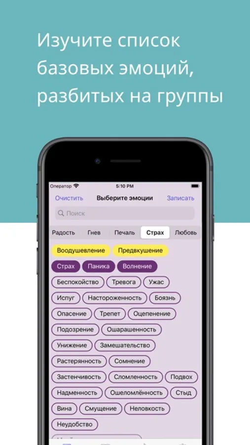 - Приложение содержит список основных эмоций, разбитых на базовые группы. Каждая эмоция содержит краткое описание. Этот список можно использовать для изучения своих эмоций.