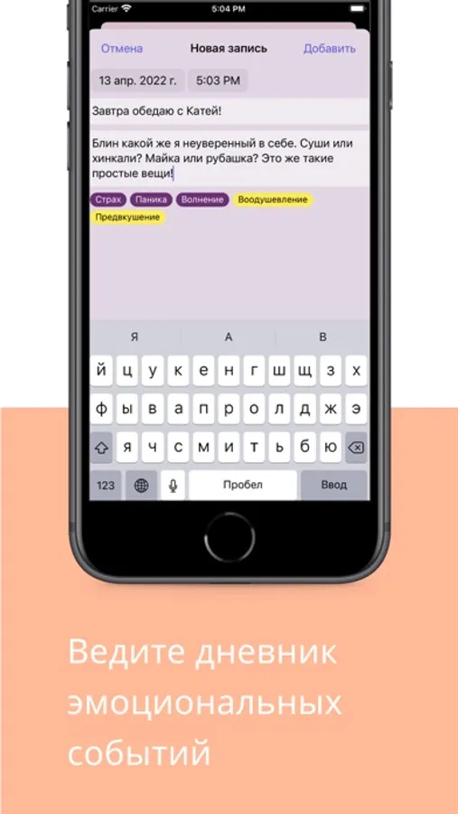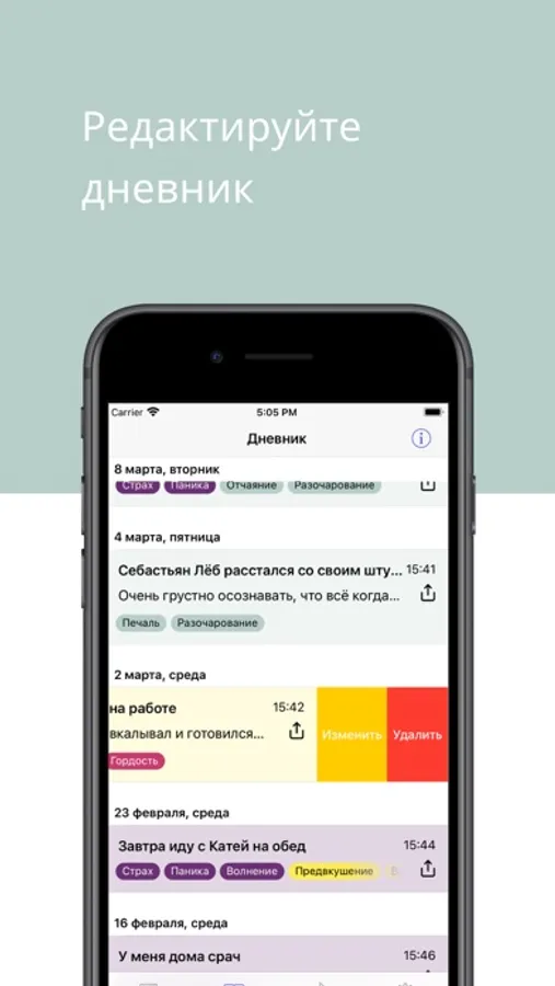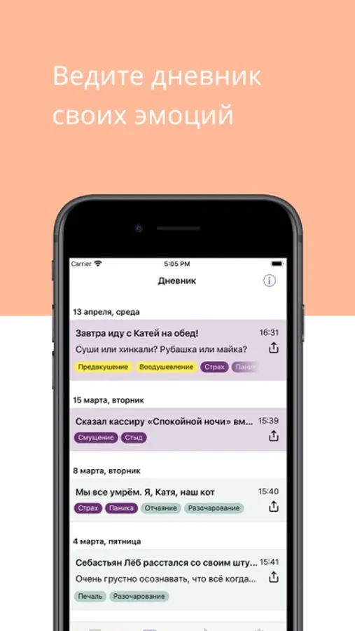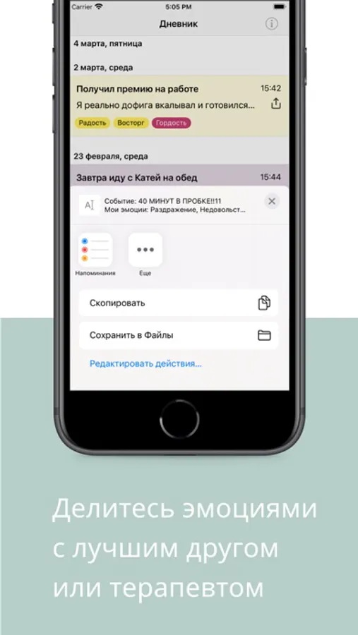 - В приложении есть возможность вести дневник своих эмоций. Можно записать событие, а также вызванные им эмоции. Этой записью можно поделиться с лучшим другом или с психотерапевтом.