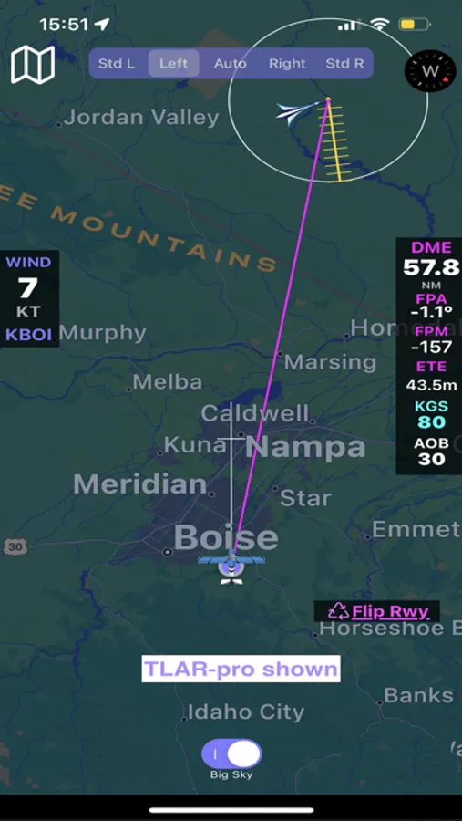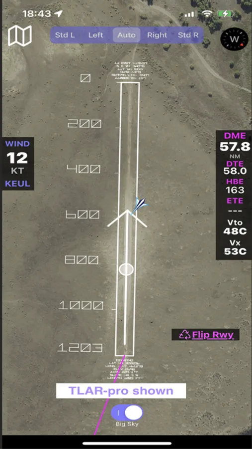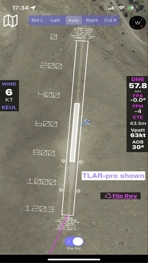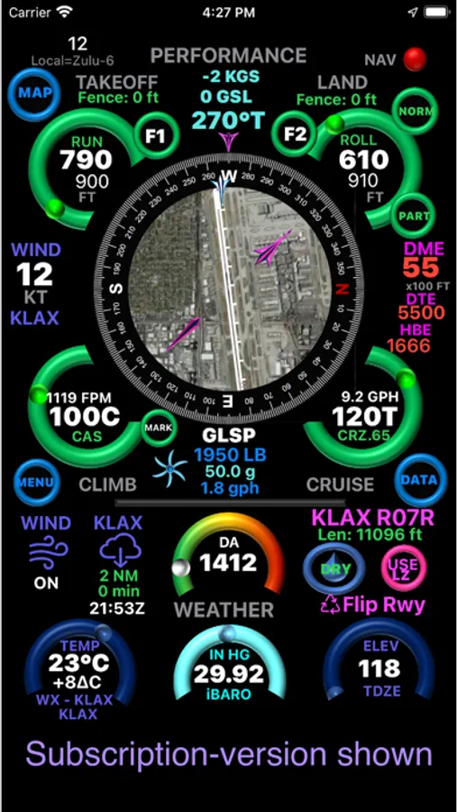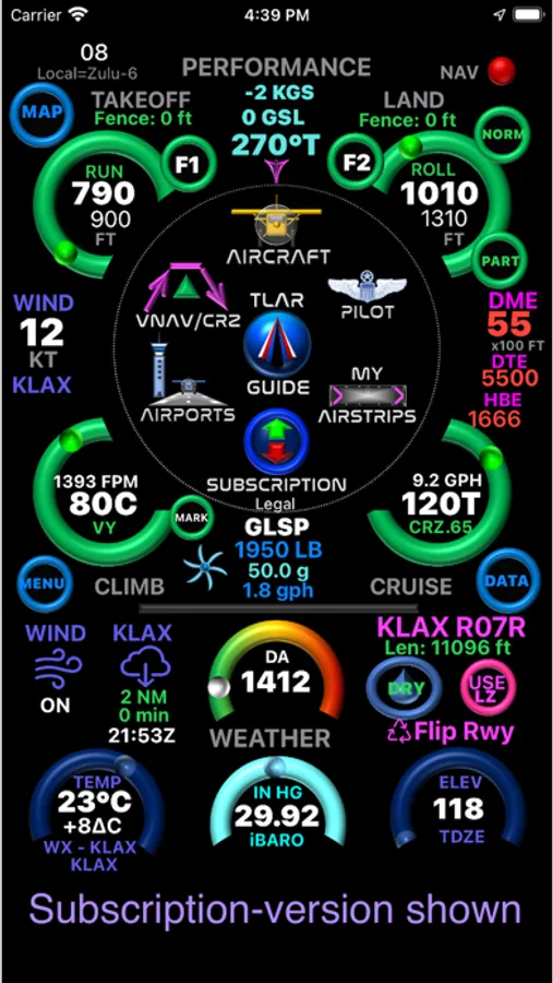 The pro version requires a subscription, but offers significantly more features and capabilities. It dynamically recalculates performance in real time responding to the aircraft's 3D position and automatically updated weather conditions. With the addition of airfield information from either the included 73,000 airfield global database or user-defined airstrips, TLAR computes additional performance metrics such as predicted height by end of the runway on takeoff, bearing, distance, glide path, and descent rate required to the airfield, predicted stopping point on the runway during landing, approach stability on short-final, displaying that status visually, and audibly in your headset (for aircraft with communication panels that can connect via bluetooth or cable to your phone). The pro version allows the pilot to set tailorable safety margins and warns the pilot if predicted performance will violate any of the set safety criteria. Other professional-level features: