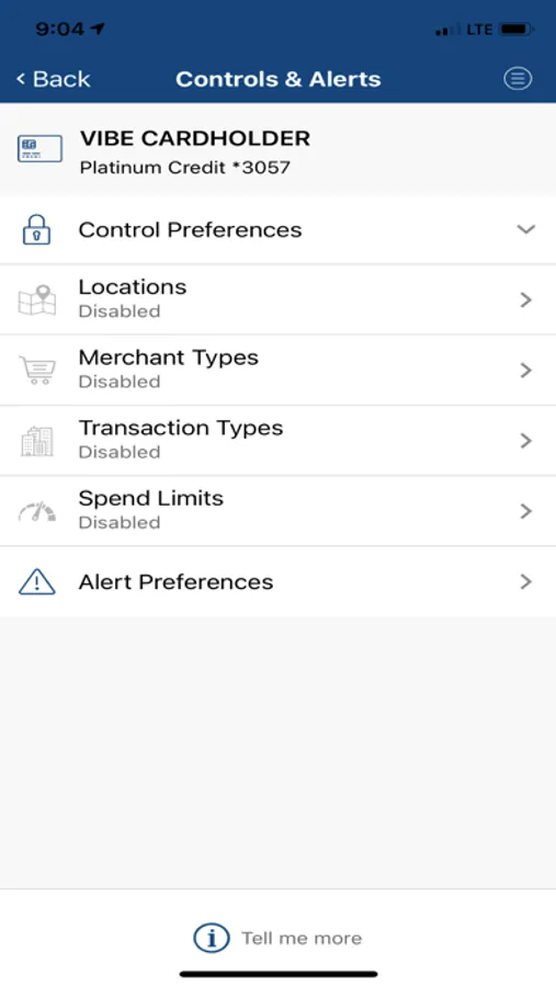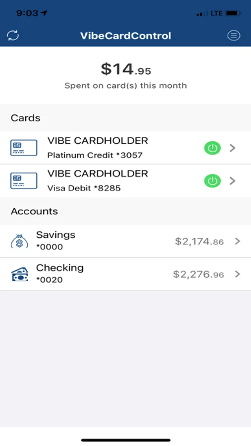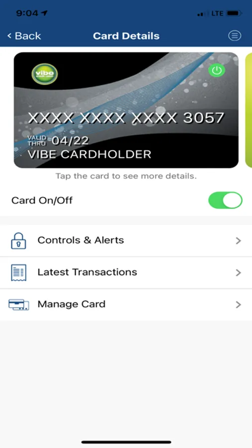 • Manage how, when and where your cards are used—on your own terms. Vibe Card Controls enables you to set controls regarding the transaction types, geographic rules, and the merchant types where your card can be used.