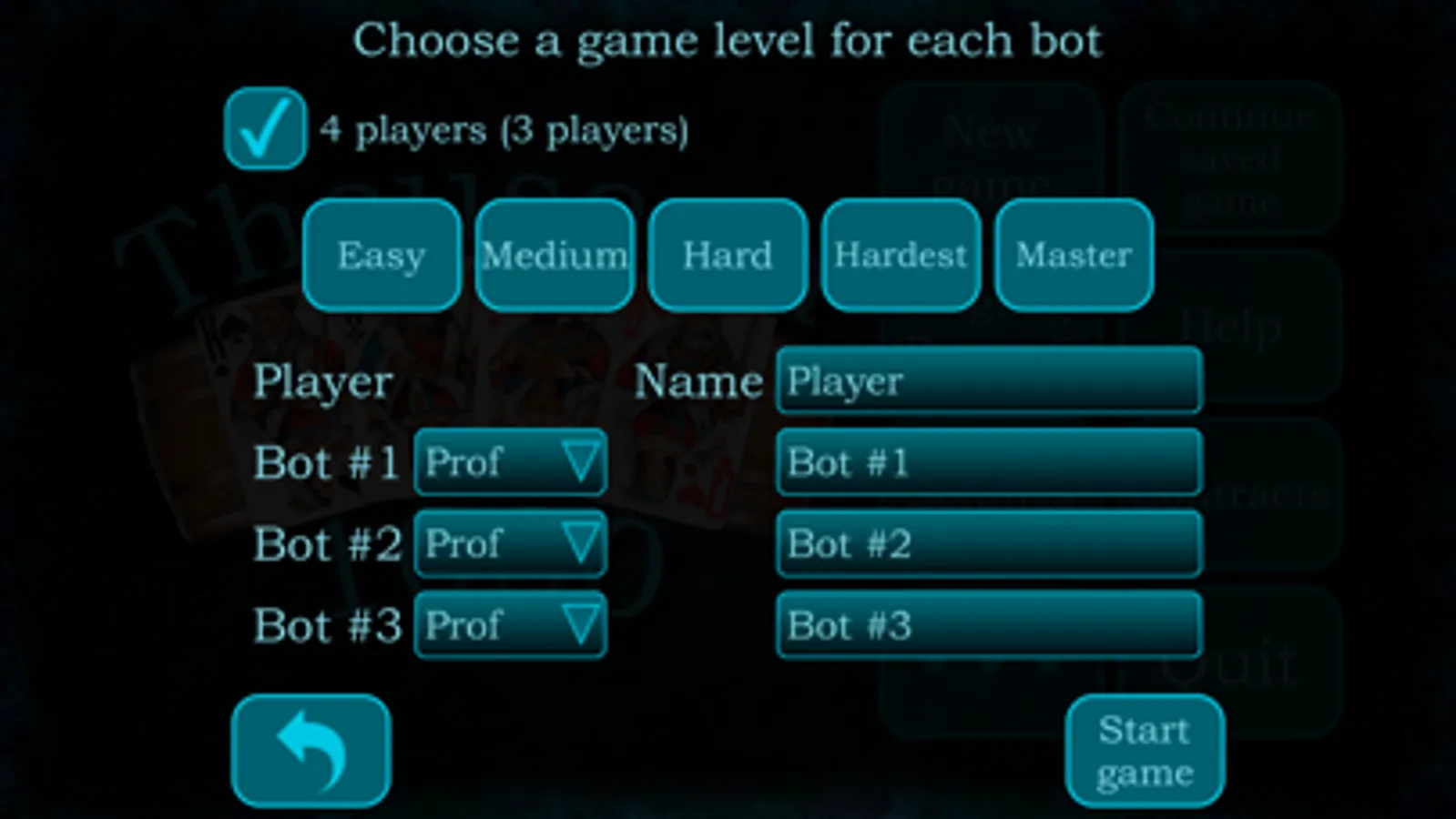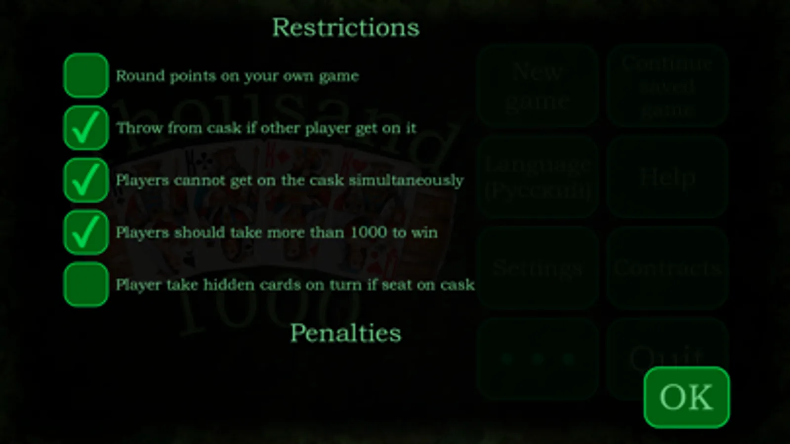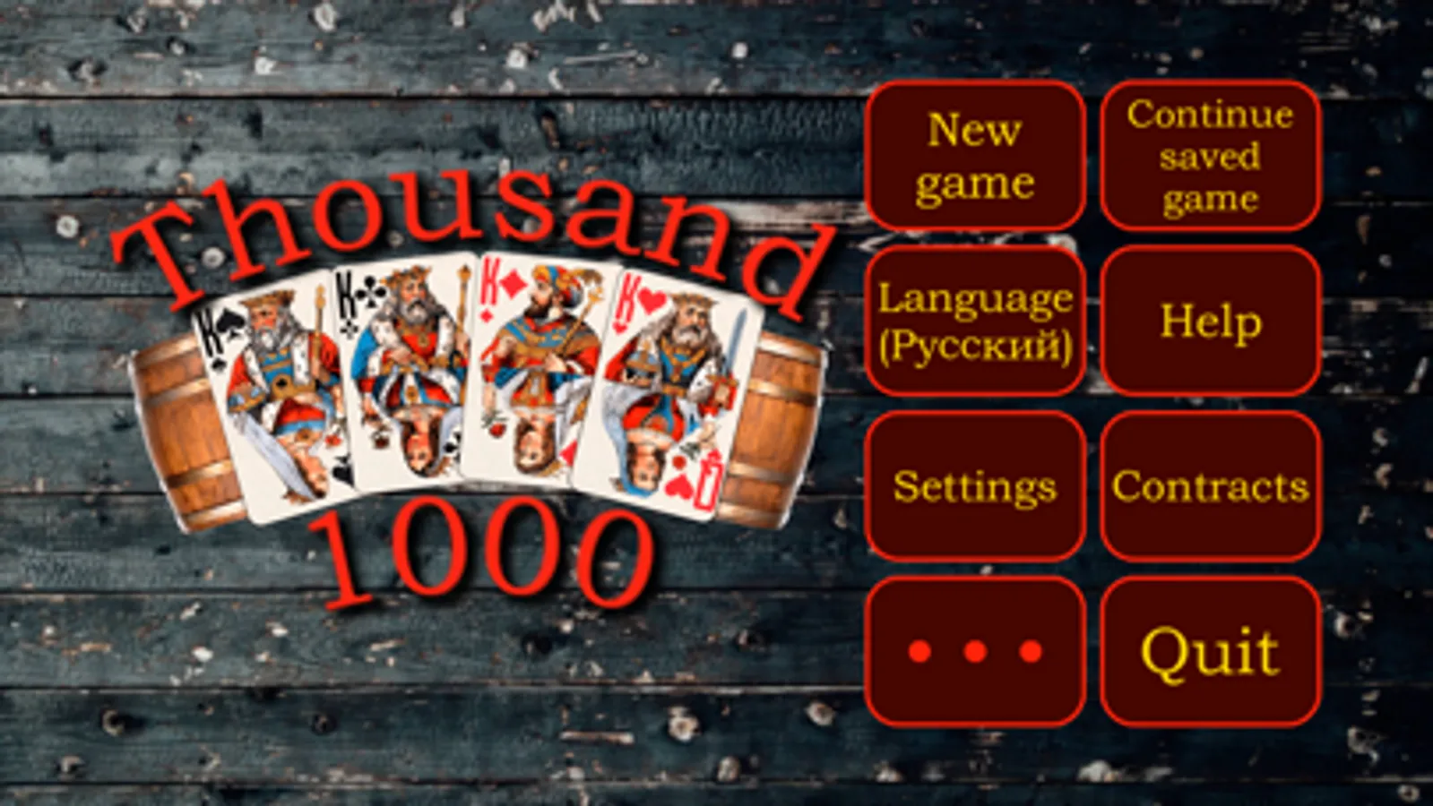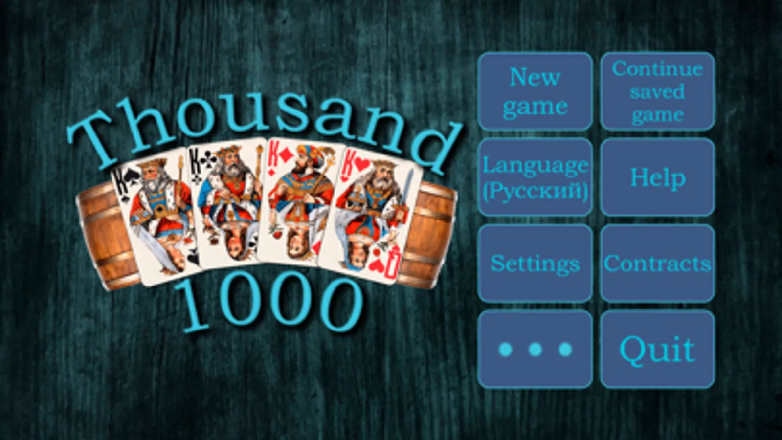 Thousand (1000) - a trick-taking card game for 3 or 4 players. One of the most popular Russian card games. The goal of the game is to score 1000 (1005) points to win. The game implements 27 agreements (rules), including / disabling which you can customize the game for yourself. Such well-known arrangements as the "golden con", "the game of the dark", "the ace of marriage", "bolts (sticks"), "alien trump cards" and others. A full list of agreements (rules) can be found in the central menu of the game - “Agreements”. A full detailed description can be found in the central menu "Help".
