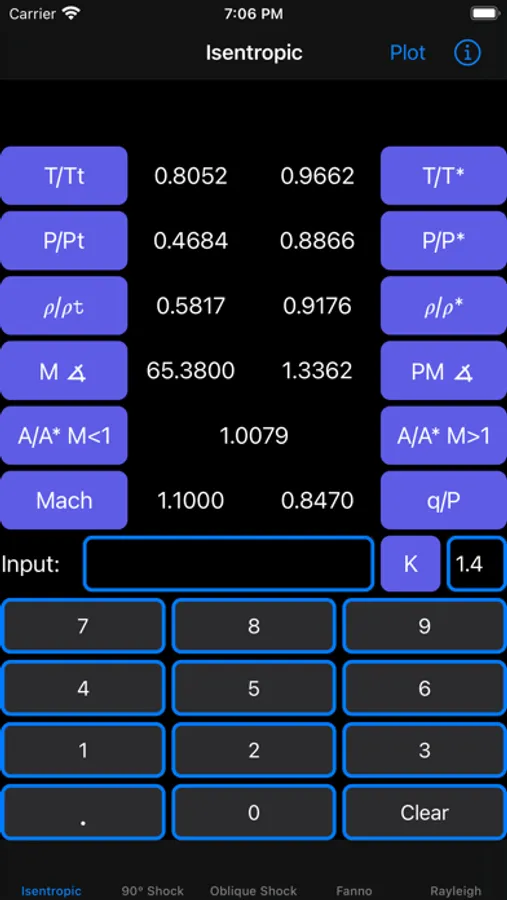 OPie Isentropic Calculator is a compressible aerodynamic flow calculator that also calculates the 90 degree (Normal) shock, Oblique Shock, Fanno Flow, and Rayleigh conditions.