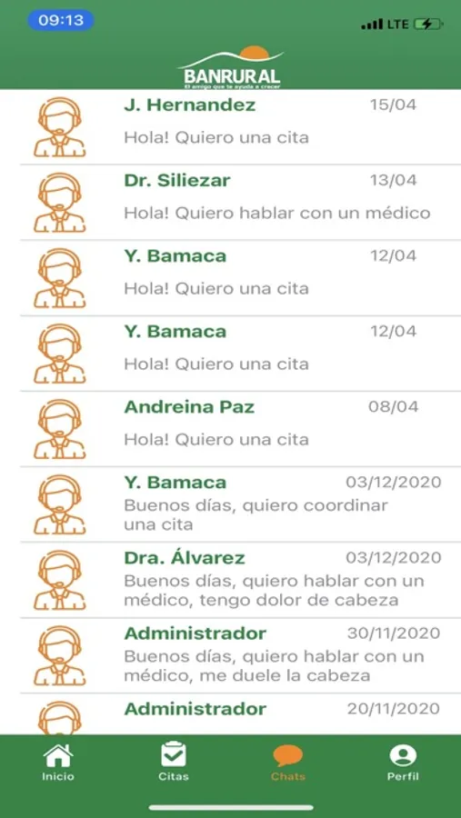 Consulta de todos los chats que se han tenido, ya sea con un médico o con un operador