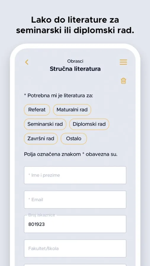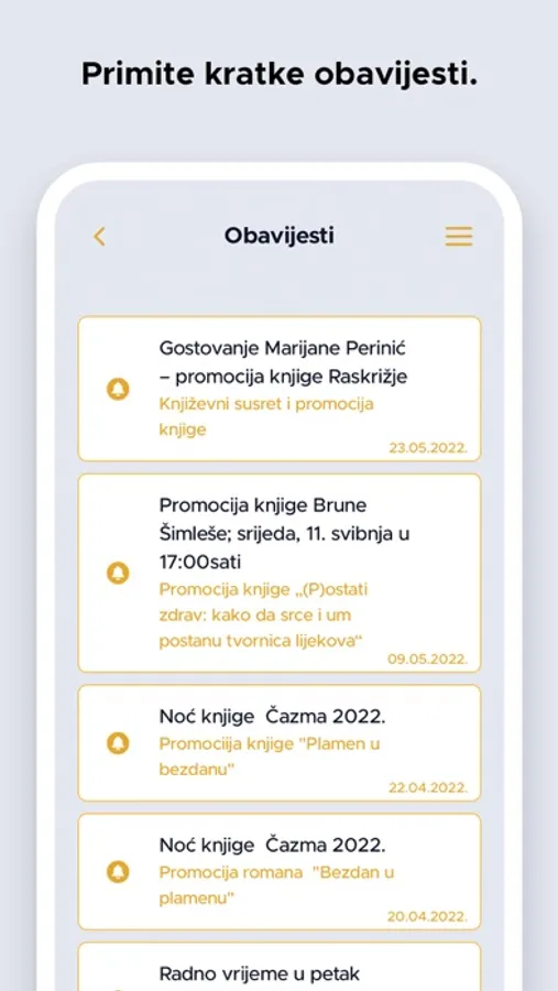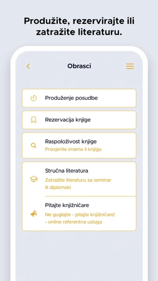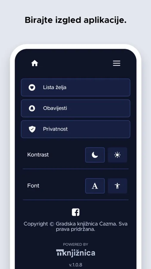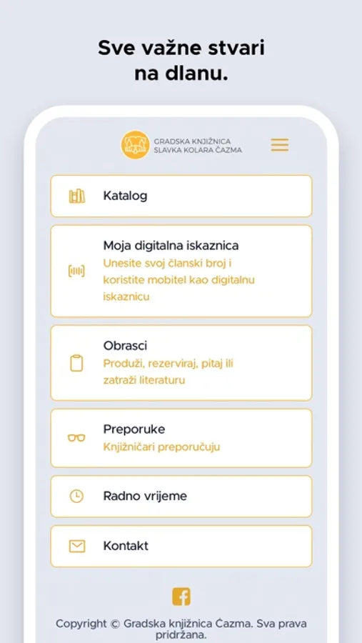 Unutar aplikacije nalaze se sve potrebne informacije o Knjižnici i njezinim uslugama (radno vrijeme, kontakt, poveznice na društvene mreže).