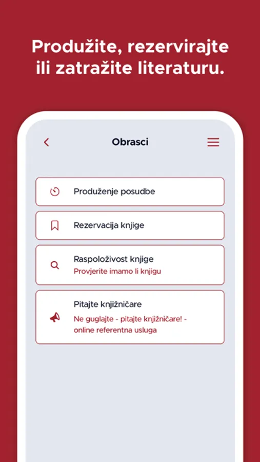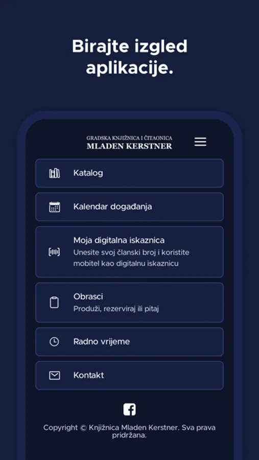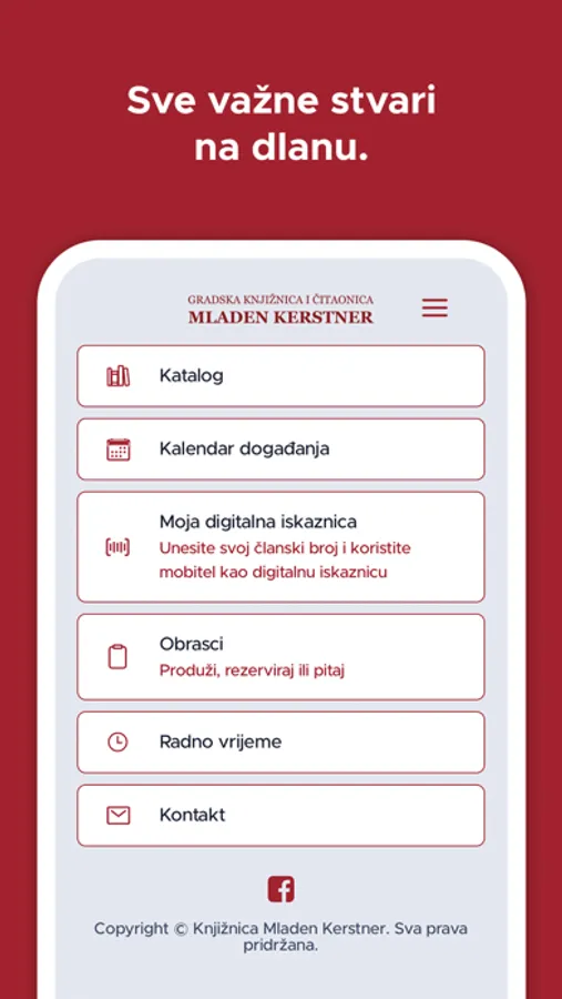 Aplikacija je namijenjena korisnicima Knjižnice i čitaonice "Mladen Kerstner" uz pomoć koje korisnici mogu pretražiti e-katalog knjižnice, pregledati kalendar događanja u knjižnici, generirati svoj korisnički broj u barkod, produžiti posudbu građe, rezervirati građu, provjeriti da li knjižnica posjeduje primjerak neke građe ili zatražiti literaturu za seminarski rad. Unutar aplikacije nalaze se i Radno vrijeme knjižnice, odgovori na Česta pitanja, kontakt podaci knjižnice te poveznica na društvene mreže.