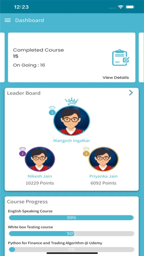 • Leaderboard, Course specific leaderboard.