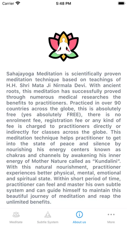 Based on the teachings of H.H. Shri Mataji Nirmala Devi known as Sahajayoga Meditation. With multiple medical research conducted across the globe, Sahajayoga Meditation is scientifically proven and probably the only meditation around the world with numerous proven benefits.