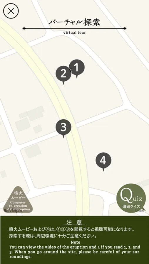 各遺跡で、所定のVRをご覧いただくと噴火の再現映像を視聴できます。