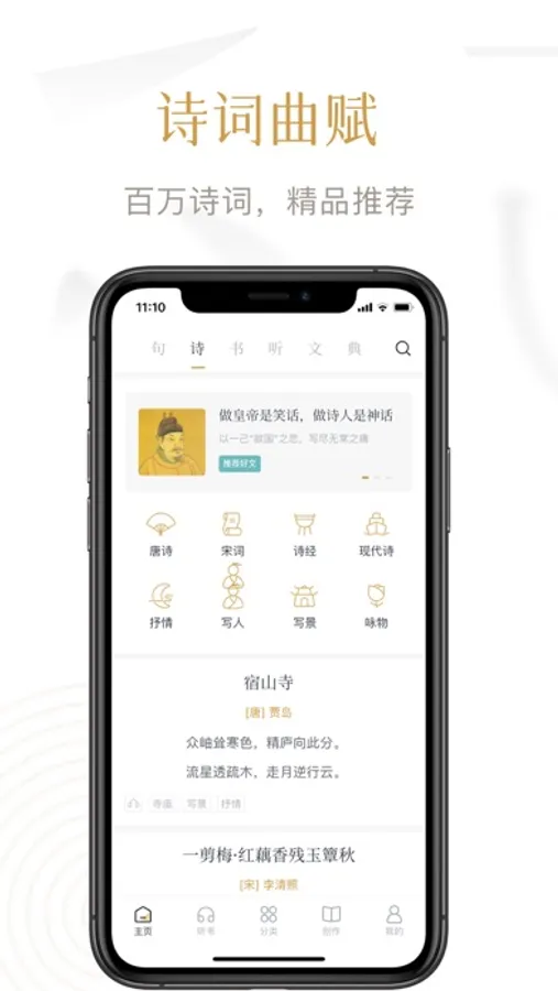 ※ 诗词曲赋:五千年沉淀的不同体裁的诗词全收录,包括古诗、楚辞、唐诗、宋词、元曲、近代诗歌,以题材、选集、手法、风格等十多个不同维度进行归类,涵盖了数百个分类,近百万首诗词。