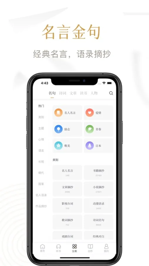 ※ 分类精细:不论是名句、诗文还是书籍、人物,都从各个维度进行全面的分类,让你能更快找到想要的内容。