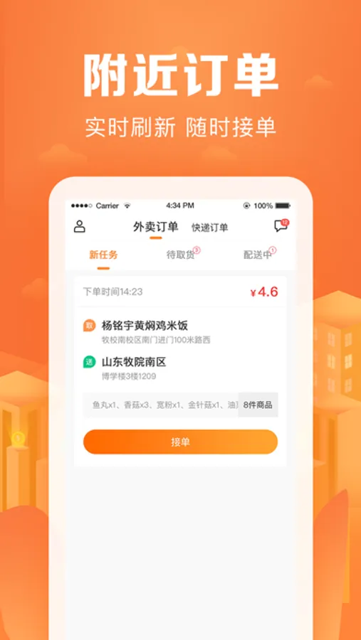 海量订单:不仅有外卖订单、众多快件代取、代买服务海量订单等你来。