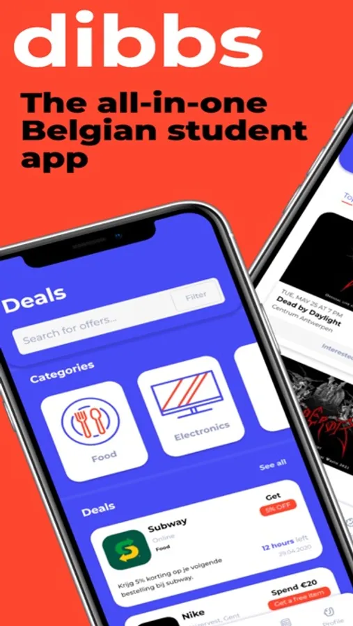 Student life has many perks. But it can be hard to find your way through all the information that’s out there. With dibbs, you’ll never have to miss out on anything ever again. Through our collaboration with several student associations and companies, dibbs provides students with all the stuff they need to get everything out of their student life. The app centralizes discounts, events, jobs, internships, helpful tips and much more all at one place. Our easy-to-use interface guides you through the different types of content and highlights what’s most interesting for you based on your location. Get introduced to new organizations and strengthen your network, save time and money or simply improve your well-being.