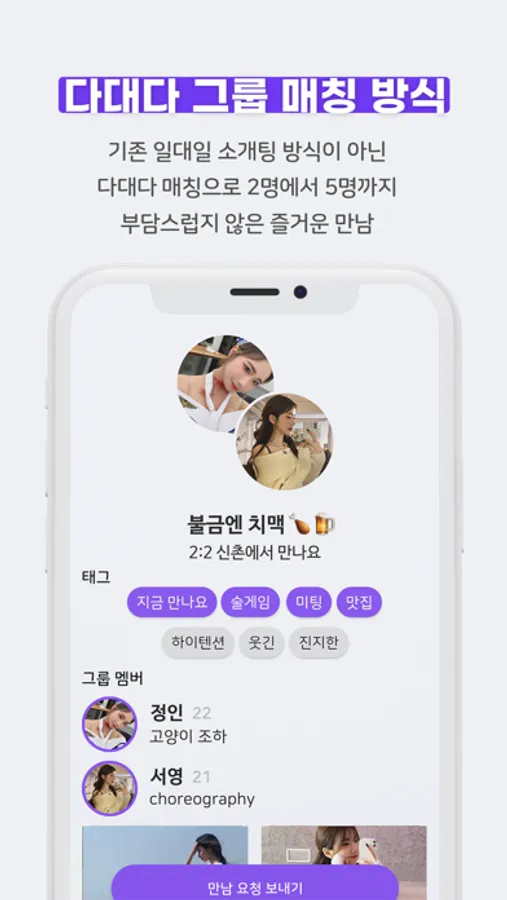 - 일대일 소개팅이 아닌 다대다 형식으로 신뢰할 수 있는 친구와 함께 2명부터 최대 5명까지.