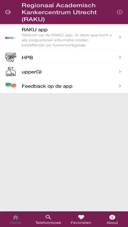 Het Regionaal Academisch Kankercentrum Utrecht (RAKU) is een samenwerkingsverband tussen het St. Antonius Ziekenhuis, het Diakonessenhuis, Meander Medisch Centrum, UMC Utrecht, Ziekenhuis Gelderse Vallei en Ziekenhuis Rivierenland. Deze app is bedoeld om informatie en contactgegevens te delen binnen de expertteams van het RAKU.