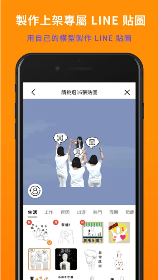 - 製作專屬Line貼圖: 將自己的3D模型選擇套用於MyMoji提供的主題貼圖中,即刻預覽貼圖效果,將欲製作的貼圖提出送審,待Line送審完畢後下載貼圖,可於Line社群中發佈使用。