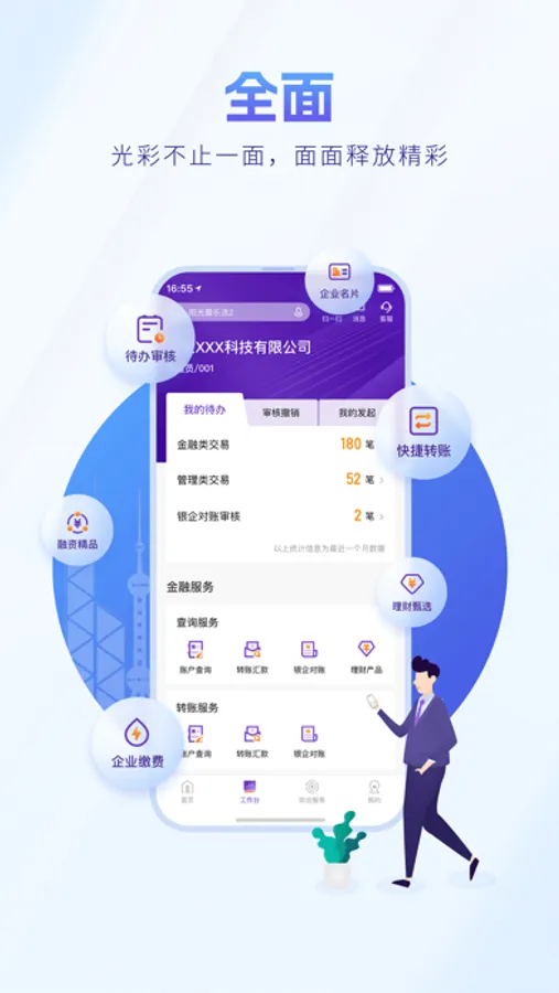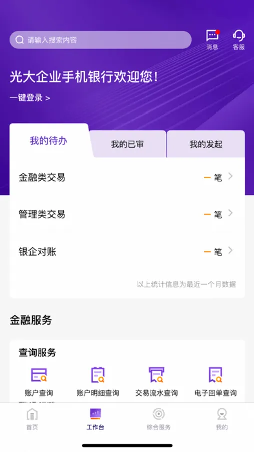 3、工作台—从“我”的角度出发,打造“财务工作台”,集中查阅待办交易、已发起交易、已审核交易,助力企业主及财务人员工作便捷高效。