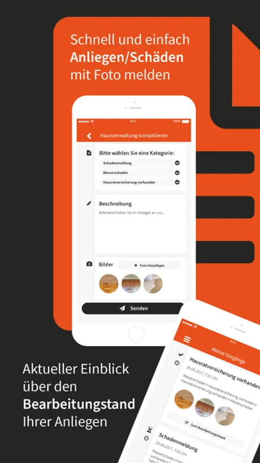 Als Mieter oder Eigentümer können Sie Schäden oder Anliegen direkt mit Fotos über unsere App melden. Ihre Anfragen stehen unseren Mitarbeiten dann zur Verfügung und können auch an Handwerksbetriebe weitergeleitet werden.