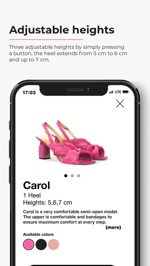 - Three adjustable heights by simply pressing a button, the heel extends from 5 cm to 6 cm and up to 7 cm.