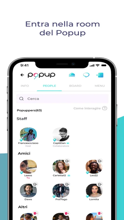 Nella Partyroom vedrai tutti i partecipanti del Popup e potrai: