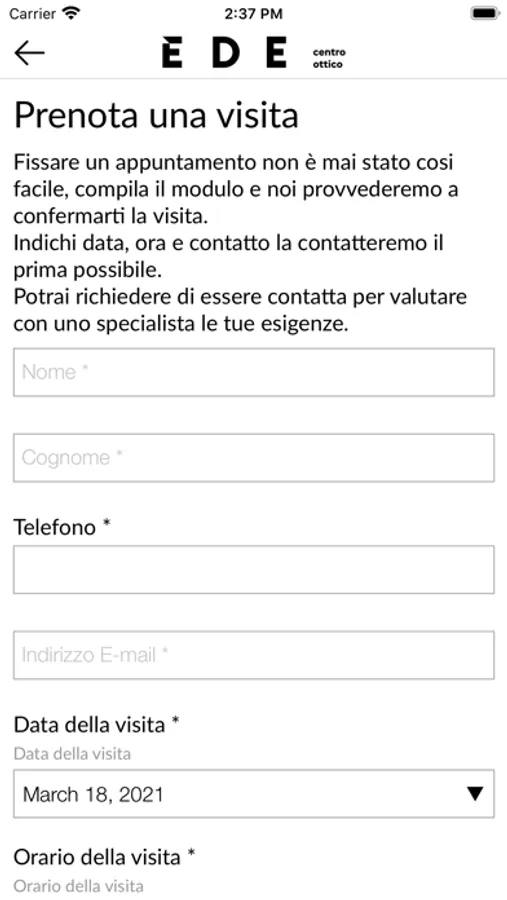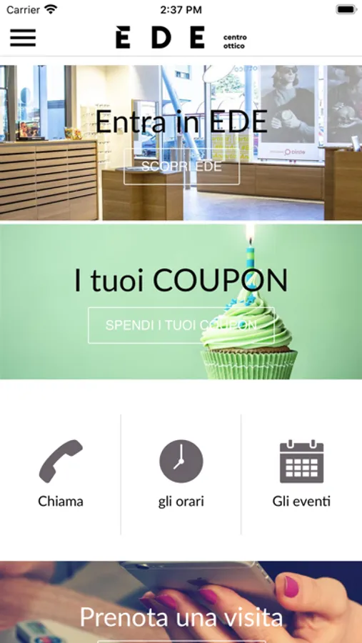 E D E centro ottico presenta la sua APP, progettata per avere diverse sezioni per aiutarla a prendere appuntamenti, per informazioni sulle sue garanzie, per tenerla aggiornata sulle nostre promozioni, sui vantaggi a lei dedicati, e sulle attività di E D E centro ottico.