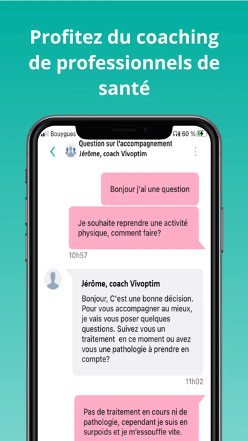 Une équipe de coachs (infirmières diplômées d’Etat, diététiciennes, enseignants APA et coachs sport-santé, addictologues, tabacologues…) répond à toutes vos questions et vous aide à atteindre vos objectifs. Ils sont joignables à tout moment et pour tout besoin via téléphone (appels et service gratuits), tchat et messagerie.
