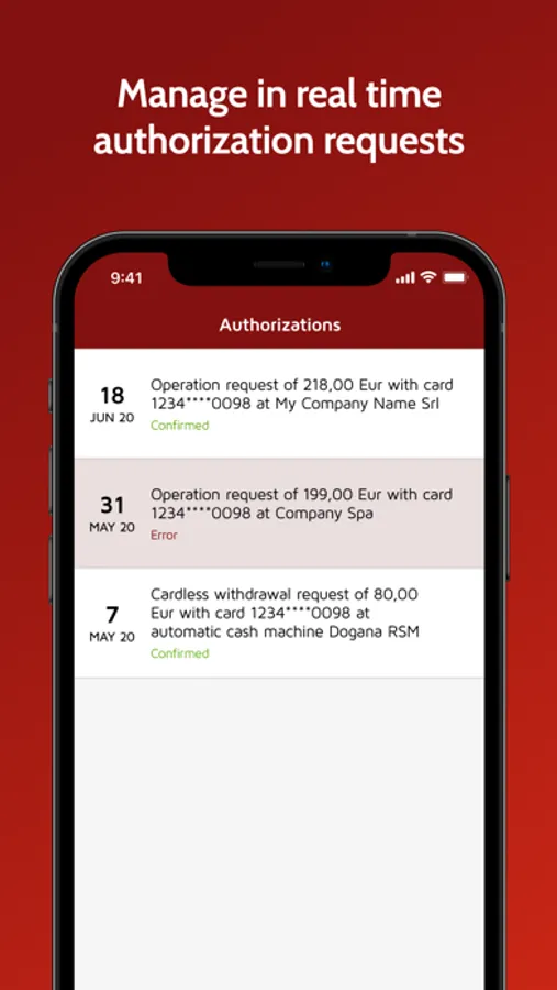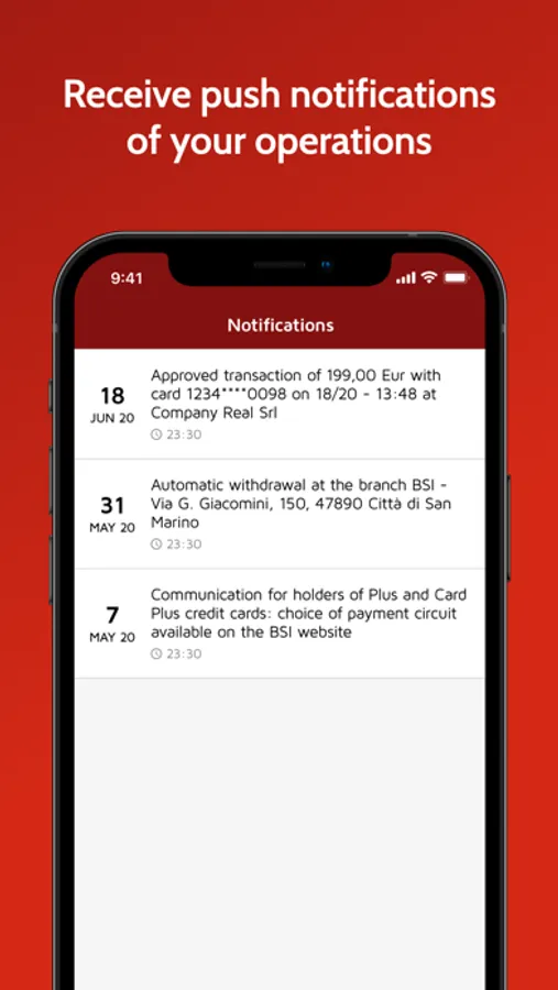 You can receive real time authorization notifications from the bank to login the Web Banking service or to complete an e-commerce payment with your credit card. You can confirm the authorization notifications using a security PIN or using digital print technology or facial recognition technology if allowed by your device