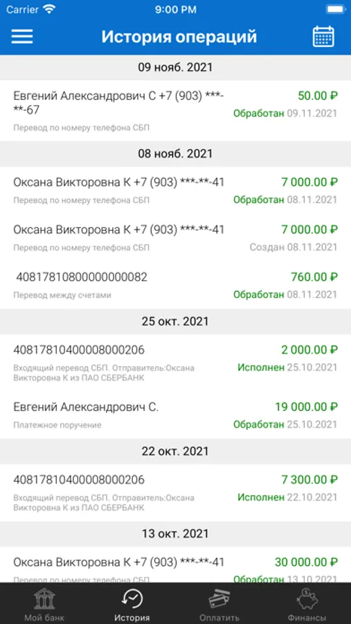 • Просмотр истории операций