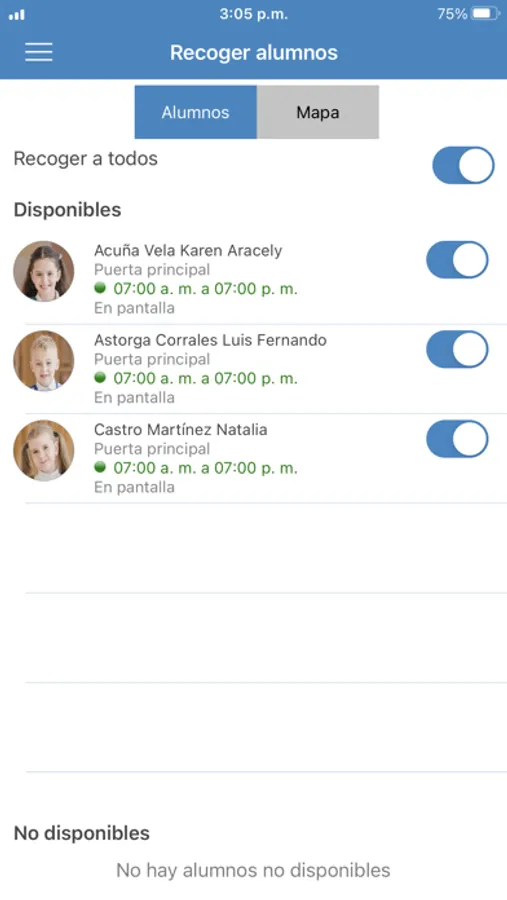 • El profesor desde su salón de clases puede apoyar la logística de entrega de alumnos utilizando su dispositivo móvil. Desde BioSafe Escolar puede monitorear qué alumnos se encuentran aún en el aula, qué alumnos ya pueden salir y cuál es su puerta de salida, así como los alumnos que ya se entregaron sus familiares.