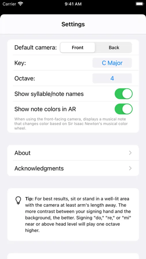 The app displays the currently recognized sign in the upper right corner and can also display the note’s corresponding color (as assigned by Isaac Newton).