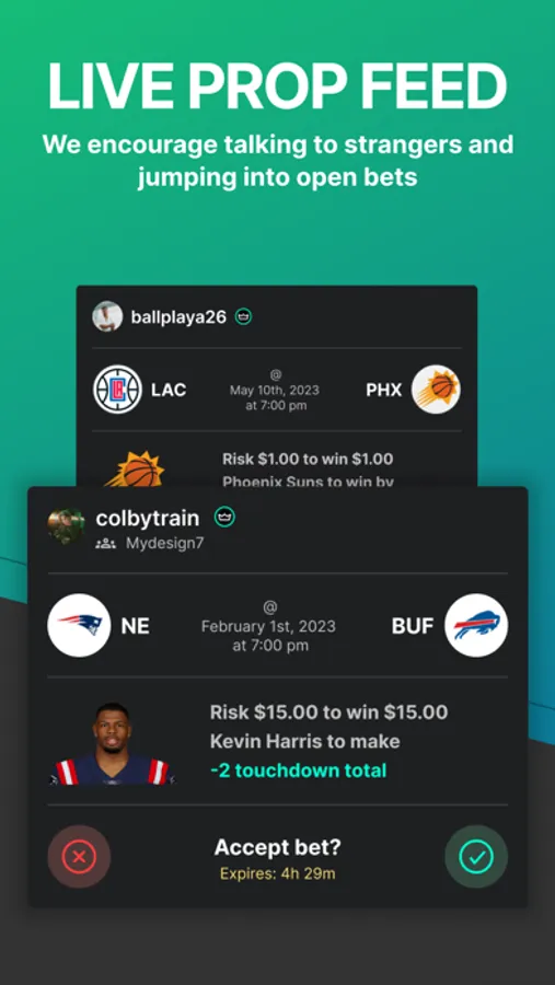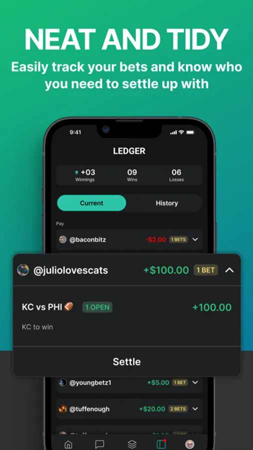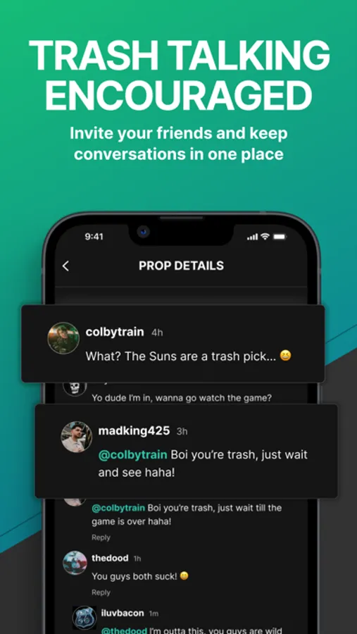 Chat about the games with your friends and colleagues like you would in other messaging apps. Here you can extend prop bets for users to take and chirp your friends as you're on the verge of winning.