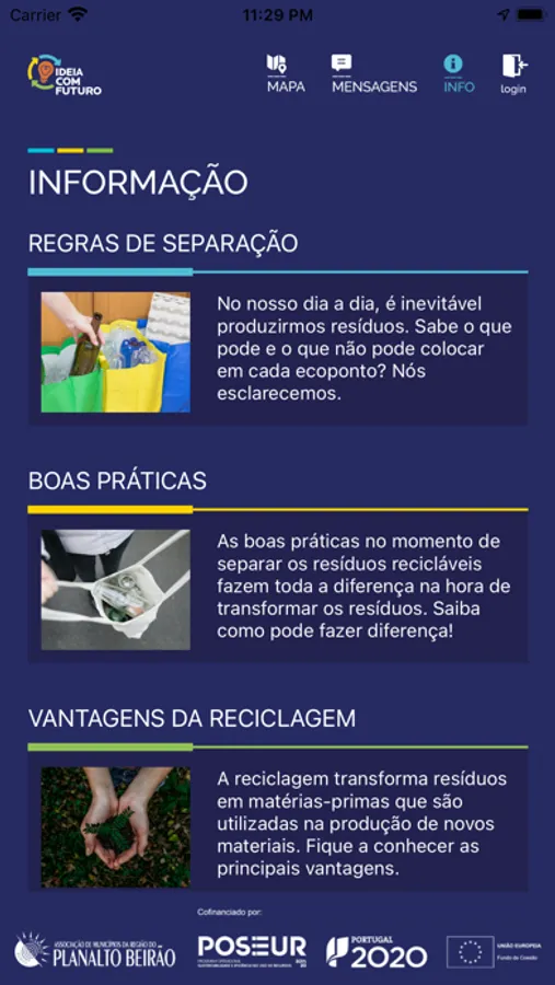A ReciclApp fornece ainda um conjunto de informações, que permitem ao utilizador conhecer às regras de separação dos resíduos recicláveis e, assim, esclarecer dúvidas sobre o que pode ou não colocar no ecoponto.