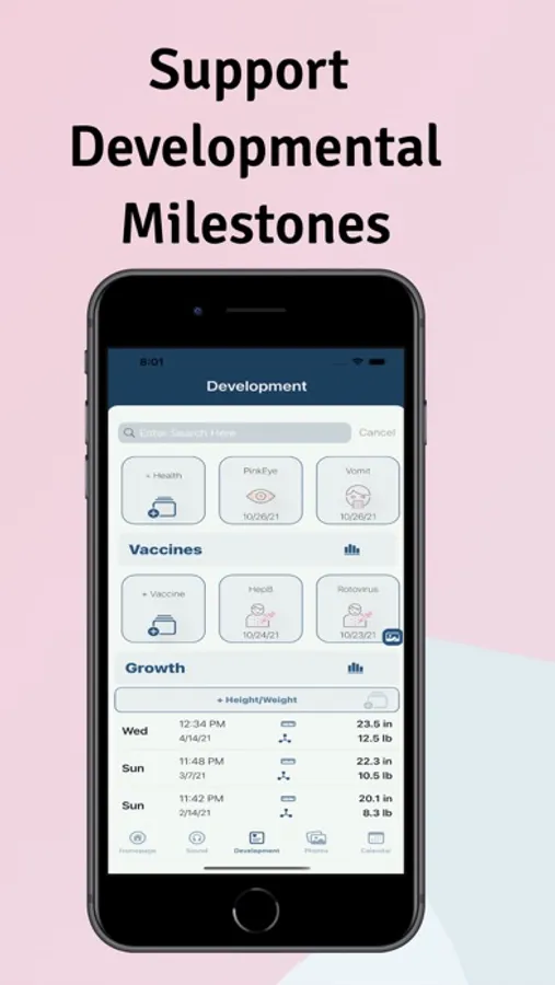 **** Track CDC & WHO developmental milestones to help coordinate with your pediatrician developmental milestones such as "rolling over", "can sit up", "first step". Use the information to stop swaddling, identify health concerns, and reinforce your child’s development in areas for improvement.