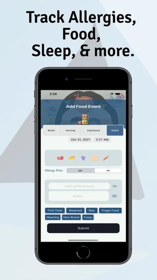 **** Feeding schedule for nursing, solids, and formula. Drill down in the data to determine if certain foods cause allergies, poor sleep habits, or irritable behavior.