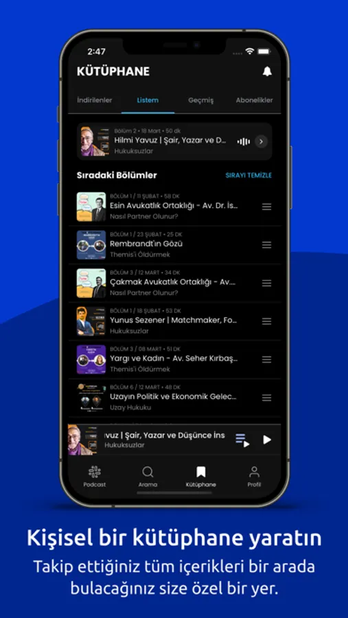 • Kişisel kitaplığınız: Şu anda takip ettiğiniz tüm podcast’leri ve dinlediğiniz bölümleri bulacağınız yer.