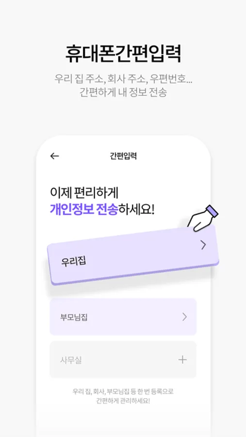 : 다수개의 이름, 성별, 휴대폰번호, 주소, 우편번호 등 개인정보를 휴대폰 앱에 등록 한 뒤, 정보 입력이 필요할 경우 휴대폰번호 입력만으로 간편하게 입력!