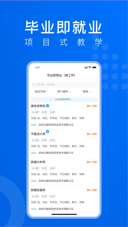 产品的核心是“企业岗位定向培养”通过将企业招聘引入平台,让教育机构开发定向岗位课程,学员通过学习岗位课程从而满足企业的岗位需求进入企业,跳过了传统的冗长招聘环节。同时线场强国应用人工智能、大数据等前沿技术,提高了人才精准匹配度,提升了求职招聘效率。