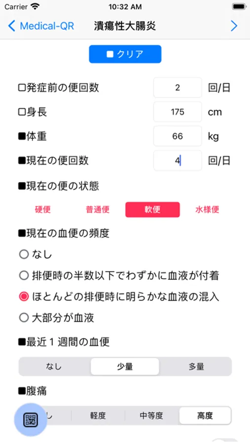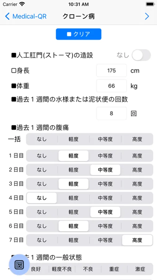 ご自身の症状を入力していただきます。QRボタンでQRコードを表示して診察時に提示してください。QRはピンチ操作で拡大縮小が可能です。