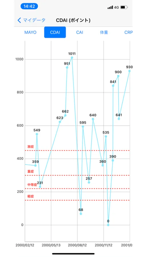 また活動評価指標だけでなく、一部の血液検査結果もご自身のスマートフォン上に取り込み時系列表示できますので、病勢の確認がしやすくなります。