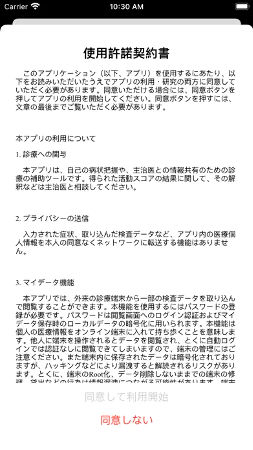 本アプリは、自己の病状把握や、主治医との情報共有のための診療の補助ツールです。得られた活動スコアの結果に関して、その解釈などは主治医と相談してください。