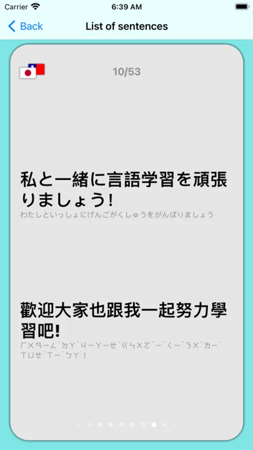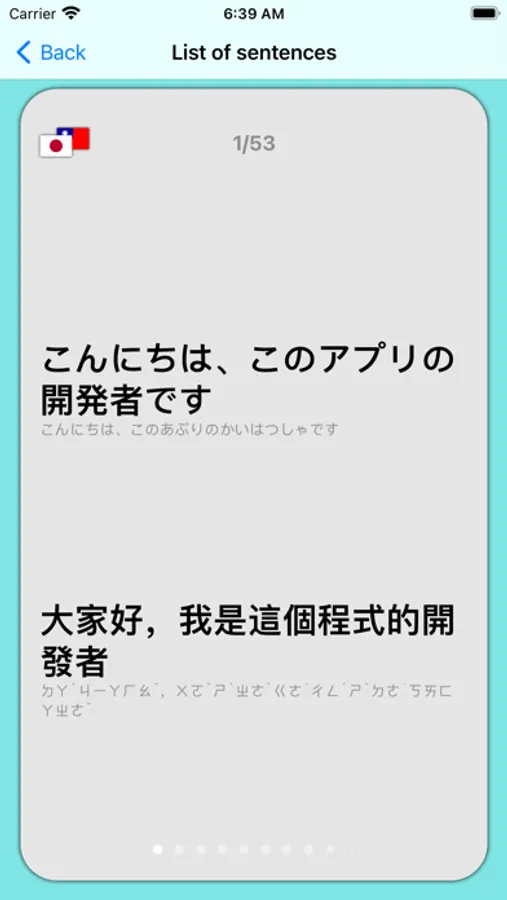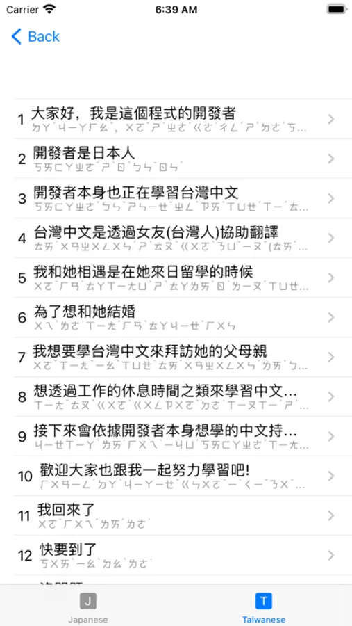 日本語と台湾中国語の学習アプリです。ネイティブの発音を聞きながら、日常で使うフレーズを覚えることができます。開発者は日本人なのですが、開発者自身も台湾中国語の勉強中で、日常で使いやすいフレーズを随時追加していく予定です。一緒に言語学習をがんばりましょう。