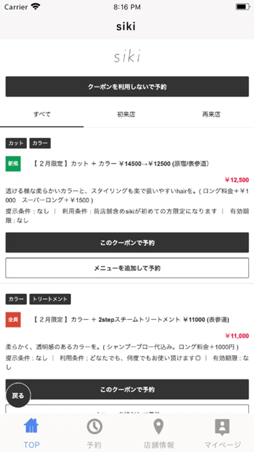 お得なクーポンが配信されます。ネット予約時にクーポン利用での予約も可能なので来店時もスムーズに施術頂けます。