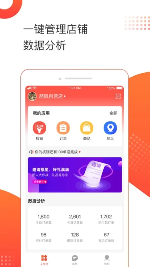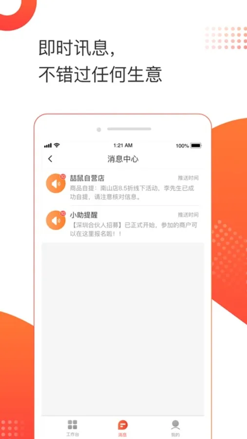 喆鼠商家版App是为喆鼠商户定制的移动版经营中心,商家可以通过喆鼠商家App接收讯息、处理查询、审核订单,完成在线经营的一系列操作,未来我们还会为商家提供更多实用的功能和数据信息,帮助商家轻松做好生意。