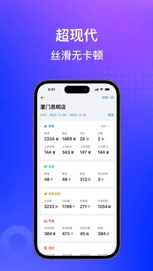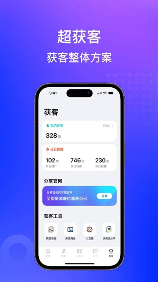 房在线-超能获客的房产中介管理系统,设计简洁却功能强大。拥有房客源管理、建立获客官网、发布端口、行程分析、新房报备分销、电子签约、隐号录音等全面功能,助力房产中介公司快速成长!