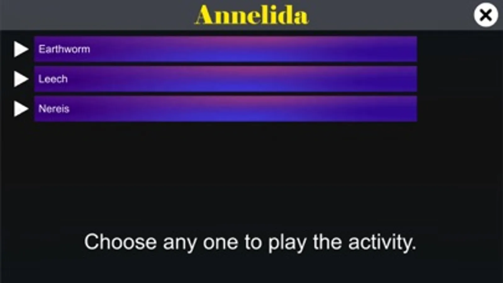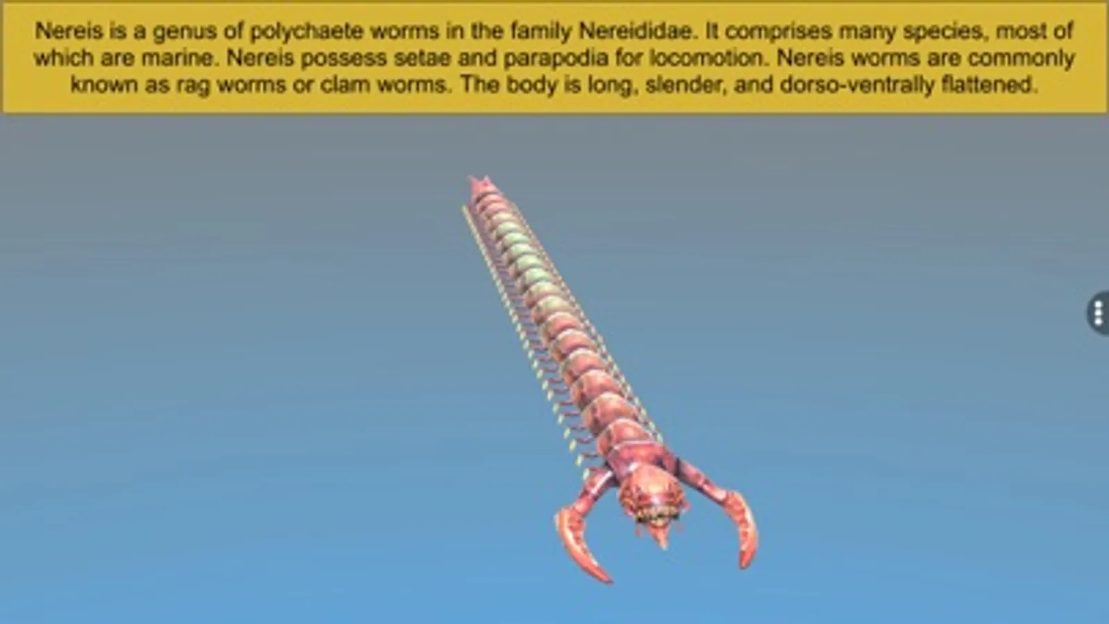Let us explore the offerings of the “Diversity of living: Annelida” app. The user first gets acquainted with various species used in the Diversity of living: Annelida. The user is then guided by the app to perform the activity with explicit instructions. This robust application is a great teaching and learning tool for students, educators and teachers wanting to study or teach about the Diversity of living: Annelida.