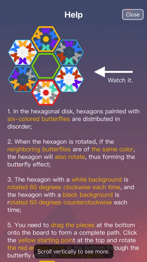 2. When the hexagon is rotated, if the neighboring butterflies are of the same color, the hexagon will also rotate, thus forming the butterfly effect;