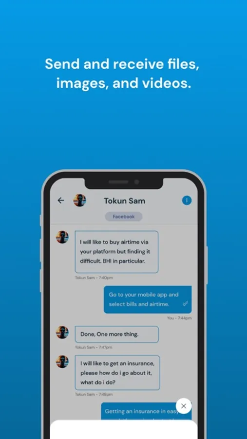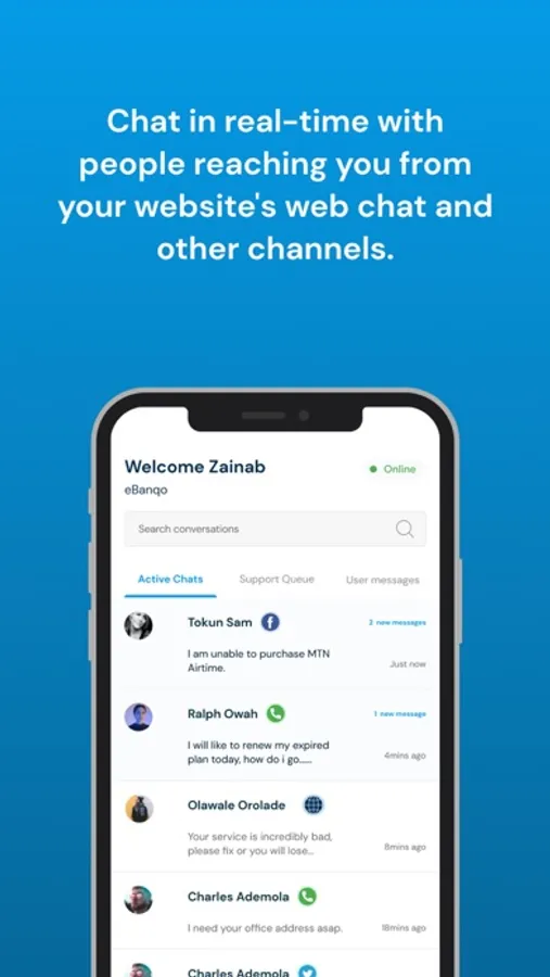 - Chat in real-time with people reaching you from your website's web chat, Mobile App chat, Facebook Messenger, Twitter Direct Messaging, WhatsApp, Google Business Messages (Search and Maps), etc.